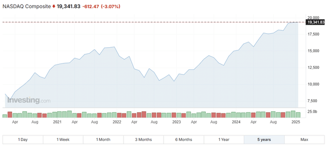 Vývoj cen kompozitního indexu NASDAQ za posledních 5 let. (Zdroj: Investing.com)*