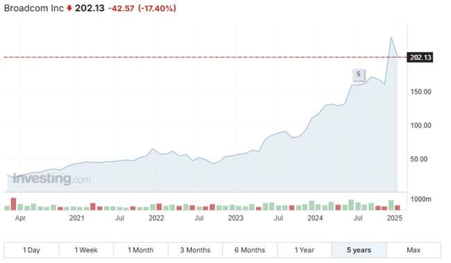 Výkonnost ceny akcií společnosti Broadcom za posledních 5 let. (Zdroj: Investing.com)*