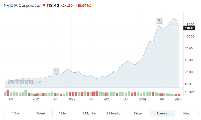 Vývoj ceny akcií společnosti Nvidia za posledních 5 let. (Zdroj: Investing.com)*