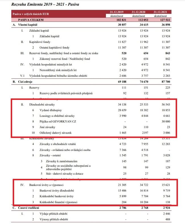 Co nám už trochu vadí je vysoký objem závazků. Pokud z bilanční rozvahy (str. 44 Prospektu) sečteme Dlouhodobé závazky a Bankovní úvěry a výpomoci, tak se dostaneme na částku 72,16 mil. EUR. Tato částka byla rapidně navýšena v loňském roce půjčkou od GEVORKYAN CZ ve výši 30 mil. EUR. Vzhledem k meziročnímu poklesu bankovních úvěrů předpokládáme, že se jedná výhodnější formu financování (detail byl- snad- rozebrán v rámci roadshow). Tato forma závazků 4,5x převyšuje provozní zisk EBITDA. Snažili jsme se částku ponížit o volnou hotovost, tou společnost na konci roku ale skoro nedisponovala (1,24 mil. EUR). To nás pravděpodobně dostává k potřebě čerstvého kapitálu.