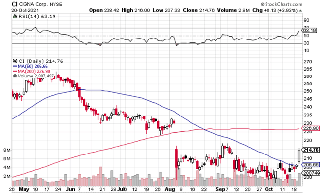 Cena akcií společnosti Cigna $CI zaznamenala za posledních 5 měsíců významné oslabení a klesla z úrovně 260 dolarů na současných 214,76 dolarů. I když byl pohyb vzhůru 20. října povzbudivý, faktem zůstává, že akcie $CI stále zůstávají hluboko pod svými krátkodobými maximy z poloviny roku.