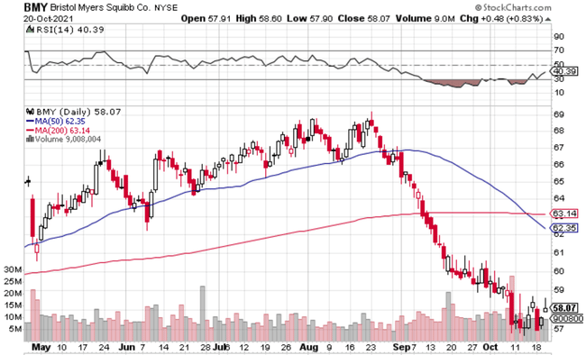 Cena akcií $BMY je mezitím nadále poměrně slabá, když se propadla z téměř 70dolarové úrovně, které dosáhla ještě v srpnu. Z technického hlediska však považuji většinu tohoto oslabení za překonanou, neboť akcie společnosti $BMY nedávno zaznamenaly podporu na úrovni 57 dolarů, jak je vidět níže.