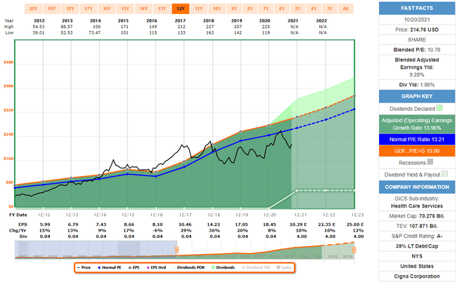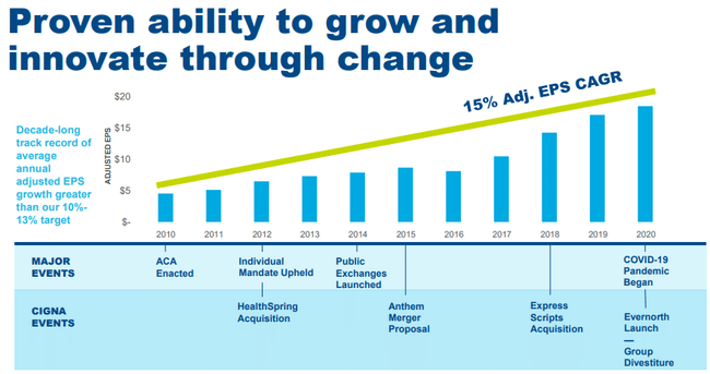 To by představovalo pokračování výnosů pro akcionáře, kterých $CI dosahovala v uplynulém desetiletí. Jak je vidět níže, společnost CI dosáhla od roku 2010 krásného 15% upraveného růstu zisku na akcii, a to díky řadě významných událostí v oblasti zdravotnictví na makroúrovni a v jednotlivých společnostech.