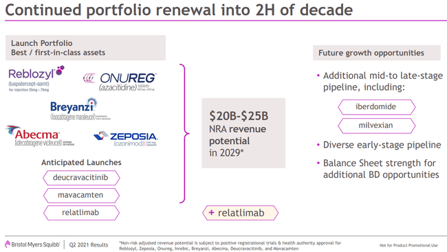 To přispělo k rozvoji podnikání společnosti BMY ve druhém čtvrtletí, kdy došlo k 13% meziročnímu růstu tržeb, přičemž u top léků (podle tržeb) společnosti $BMY Revlimid, Eliquis a Opdivo byl zaznamenán dvouciferný růst v rozmezí 11-29 %. Při pohledu do budoucna vidím důvody k optimismu, protože společnost $BMY jasně disponuje robustním portfoliem prvotřídních léčiv. Jak je vidět níže, očekává se, že tyto léky do roku 2029 přinesou roční tržby ve výši 20-25 miliard dolarů.