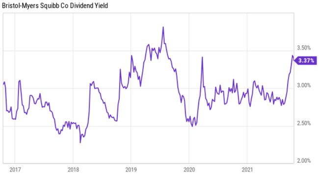 Dividendový výnos společnosti $BMY se tak zvýšil na 3,4 %. Dividenda je dobře krytá, s nízkým výplatním poměrem 26 %, a přichází se 14letou historií každoročního zvyšování, včetně 9% nárůstu v loňském roce. Jak je vidět níže, dividendový výnos $BMY je nyní na jedné z nejvyšších úrovní za posledních 5 let.