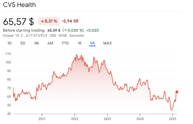 CVS Health se v minulém roce příliš nedařilo dosahovat očekávaných čtvrtletních výsledků a dokonce přistoupil ke snížení ročních prognóz na rok 2024. Důvodem byly vysoké náklady pojišťovací jednotky Medicare, která tvoří polovinu výdajového „koláče“, k čemuž se přidaly další problémy. Nejnovější výsledky spolu s pozitivním výhledem na rok 2025 proto uklidnily investory, což se odrazilo i na akciích společnosti. Ty otevřely obchodní den 12. února 2025 o 10 % výše na 60,59 USD a v následujícím dni si připsaly dalších přibližně 10 %. K 19. únoru 2025 klesla cena akcií na úroveň 65,57 USD. Od začátku tohoto roku si připsaly více než 46 %. Meziročně CVS na burze ztratilo 15 %, přičemž z pětiletého pohledu bylo ve ztrátě asi 8 %.*