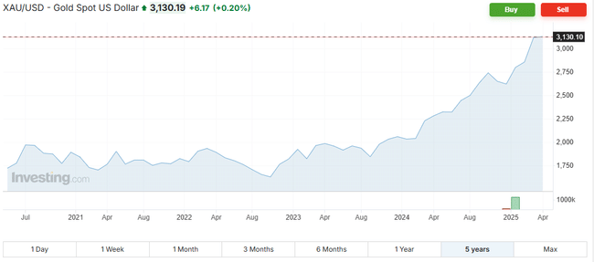 Žltý kov začal nový mesiac na novom historickom maxime, keď v ázijskom obchodovaní 1. apríla 2025 dosiahol úroveň 3 148 USD a ukončil najlepší štvrťrok za posledných takmer 40 rokov. V priebehu dňa z tejto hodnoty ustúpil. Psychologickú hranicu 3 000 USD zlato dosiahlo len pár týždňov predtým, 17. marca 2025, pričom od začiatku roka si pripísalo 18 %. V rovnakom období minulého roka sa obchodovalo o viac ako 35 % nižšie, zatiaľ čo počas 5 rokov si pripísalo robustných 82 %.*