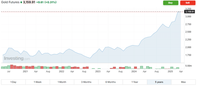 Vývoj cien futures na zlato s dodaním v júni 2025 za posledných 5 rokov (Zdroj: Investing.com)*