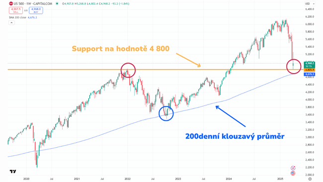 Pokud by se cena dostala pod tuto klíčovou hodnotu, mohl by index S&P 500 odepsat minimálně další 2,5 %. Na 4650 bodech je totiž 200denní klouzavý průměr, který cenu podržel v roce 2022. Pokud by ale i ten cena nerespektovala, no...klidně bychom mohli vidět po letech hodnotu 4000.