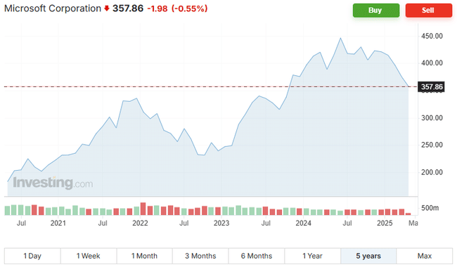 Pri pohľade na výkon akcií Microsoftu (MSFT) na burze NASDAQ je vidieť, že majú za sebou silný rok 2024, za ktorým stál hlavne záujem o AI a cloud. Od začiatku roka však čelili korekcií, ktoré viedli k poklesu ich hodnoty na 357 USD k 8. aprílu 2025, pričom medziročne sa akcie obchodovali nižšie o 15 %. Napriek tomu sú z dlhodobého hľadiska na vysokých úrovniach a za 5 rokov si pripísali viac ako 95 %.* Microsoft sa síce pohybuje v červenom, pre investorov to predstavuje príležitosť na nákup za lepšie ceny, keďže fundament spoločnosti a dopyt po AI zostávajú silné.[2]