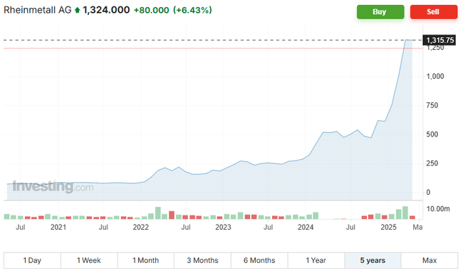 Akciám Rheinmettal (RHMG) sa darí aj na burze vo Frankfurte. V marci 2025, keď bol oznámený stimulačný obranný balík, dosiahli historické maximum 1 445 EUR (1594 USD). K 8. aprílu ich cena mierne skorigovala na 1 320 EUR (1456 USD), pričom od začiatku roka si pripísali robustných 118 %. Pred rokom sa akcie Rheinmettal obchodovali o 143 % nižšie, zatiaľ čo pred 5 rokmi bola ich cena 73 EUR (81 USD), čo je rozdiel až 1 708 %.* Korekcia spolu s vyhliadkami EÚ poukazujú na priestor na pokračujúci rast.[6]