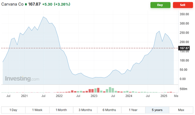 Akcie Carvany (CVNA) si na burze v New Yorku (NYSE) prešli volatilným obdobím, pričom posledné mesiace sú opäť v hľadáčiku investorov. K 8. aprílu 2025 bola ich hodnota 167 USD, čo predstavovalo medziročný nárast o 122 %, pričom z 5-ročného pohľadu išlo o viac ako 79 %. Aj keď táto úroveň predstavovala pokles z 3-ročného maxima 285 USD zo začiatku februára 2025, ide o výrazné zotavenie v porovnaní s rokom 2022, kedy bola cena akcií 5 USD. Korekcia prišla po historickom maxime 337 USD v roku 2021.* Aj keď akcie v mierne ustúpili, vývoj naznačuje, že stále majú priestor na rast.[4]
