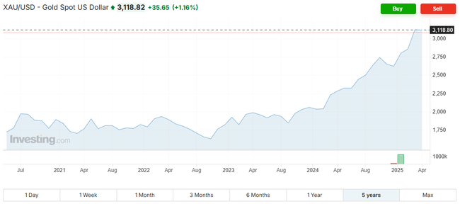 Drahému kovu se podařilo částečně vymazat ztráty, když k 10. dubnu 2025 vzrostla na 3 118 USD. Růstu předcházel pokles pod psychologickou úroveň 3 000 USD, přičemž jen v prvních dvou dubnových dnech dosáhla jeho cena historického maxima přibližně 3 150 USD. Stejný vývoj byl i v případě futures kontraktů na zlato s dodáním v červnu 2025. Po předchozím propadu jejich cena k stejnému dni vzrostla na 3 132 USD. Navzdory poklesům bylo zlato od ledna 2025 v zisku 17 %. Za poslední rok vzrostla jeho cena o 33 % a během 5 let to bylo až 80 %.*