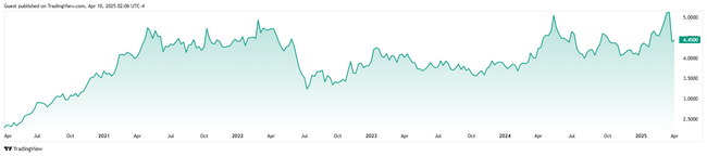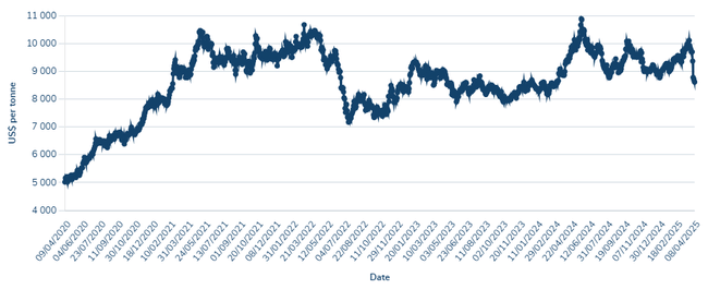 Podobná situace nastala i na Londýnské burze kovů (LME), kdy cena 3měsíčních futures klesla k 10. dubnu 2025 na úroveň 8 613 USD za tunu, což bylo přibližně jejich roční minimum. Jejich hodnota začala klesat už 25. března 2025, kdy ustoupila z psychologické úrovně 10 tisíc USD, což bylo způsobeno přesunem kapitálu na americký trh v důsledku obav z cel. Zajímavostí je, že březnové pohyby na burzách LME a Comex byly zcela odlišné, což je vzácná situace, protože obvykle vzájemně kopírují své pohyby. To nám naznačuje, jak mohou cla výrazně ovlivnit běžné obchodování. Současné poklesy způsobily, že kontrakty od začátku roku ztratily na hodnotě 1,7 %, zatímco z ročního pohledu to bylo 8 %. Pozitivnější je 5letá výkonnost, kdy si připsaly 71 %.