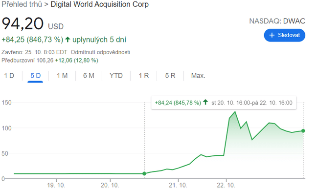 Tato předběžná dohoda zatím akciím DWAC velmi prospívá, jak se v posledních 5 dnech ukázalo...