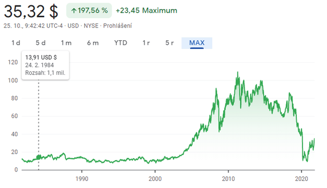 Rychlý pohled na graf $OXY ukazuje dvě hlavní zajímavé technické známky: a) Na 40$ je jasný obrat trendu a proražení předchozí rezistence a za b) pořád jsme se ani nevrátili na hodnoty přes březnových pandemickým propadem.