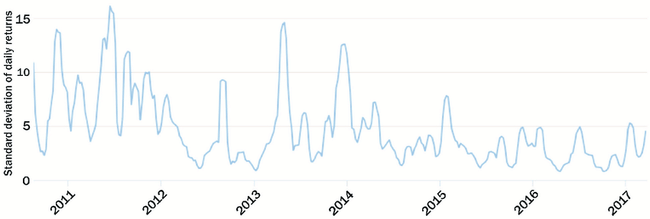 Termín volatilita označuje míru, do jaké cena aktiva v průběhu času kolísá. Obecně řečeno, nejistota ohledně budoucí hodnoty kryptoměn a skutečnost, že často nejsou kryté fyzickými aktivy, znamená, že jsou obvykle považovány za volatilnější než akcie.
