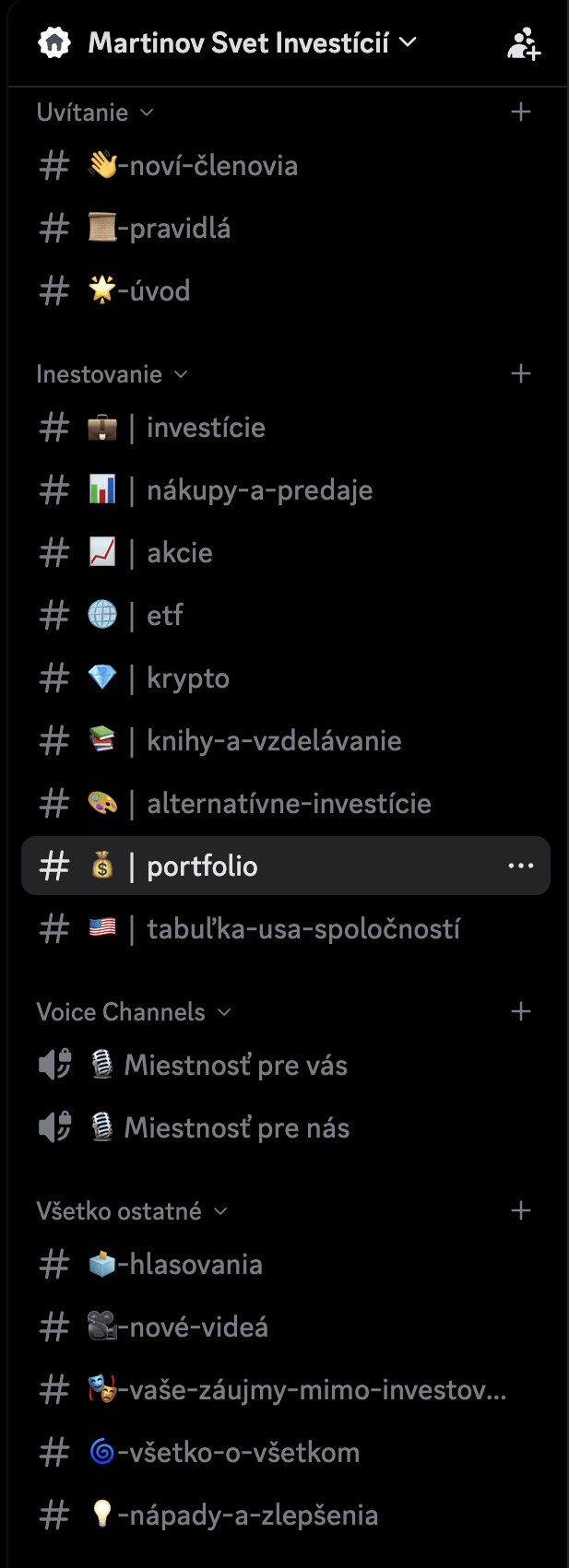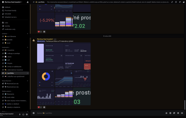 Myslím , že som vám to sem ešte nepísal , no pokiaľ by ste mali záujem sa pripojiť k mojej komunite investorov , tak vám tu prikladám link na DIscord. Táto komunita je úplne bezplatná a nikdy ani nebude platená. V skupine riešime dosť tém a zároveň tam ja ale aj ostatní investori zieľame live nákupy a vždy na konci týždňa tam zdieľam aj prehľad portfólia. Priložím vám aj nejaké fotky aby ste vedeli o čom asi rozprávam. Budem veľmi rád pokiaľ sa tam stretneme , pretože viac hlav viac kapusty :D a myslím , že z toho môžeme profitovať všetci vzájomne.