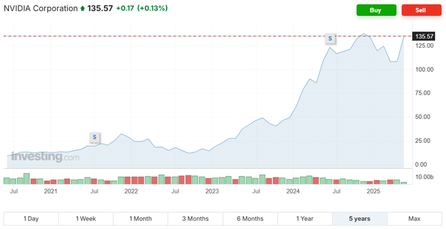 Trh s umelou inteligenciou sa zdá byť za posledné mesiace napätý, pričom stávky na návratnosť investícií sú vysoké. Na segment navyše vplývali aj colné opatrenia zo strany Donalda Trumpa. Preto je pri pohľade na výkon Nvidie na burze NASDAQ vidieť , že jej akcie boli v tomto roku v korekcií kedy ich hodnota začiatkom apríla klesla pod úroveň 95 USD. K 20. máju 2025 vzrástla cena na 135,57 USD, čím znížila stratu od začiatku roka na necelé 2 %. Napriek nedávnym poklesom boli akcie v zisku za posledný rok viac ako 27 %, zatiaľ čo z 5-ročného pohľadu išlo až o 1 327 %.*