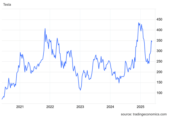 Jak jsme již zmínili, Tesla, která byla donedávna symbolem vrcholu inovací v oblasti elektromobility, v současné době prochází nelehkým obdobím. Konkurence roste exponenciálním tempem a prodeje v celosvětovém měřítku mají sestupnou trajektorii. K negativnímu vývoji navíc přispívá i pověst samotného generálního ředitele Elona Muska. Je pod palbou kritiky za kontroverzní výroky a politické vazby. Jako celek se tyto fundamentální faktory tradičně promítají do vývoje ceny akcií Tesly. Na dubnové minimum byla cena v korekci o téměř 60 % od absolutního maxima a od tohoto okamžiku došlo k obnovení růstu o stejné procento, ale k dosažení absolutního maxima musí cena vzrůst o dalších 44 %.*
