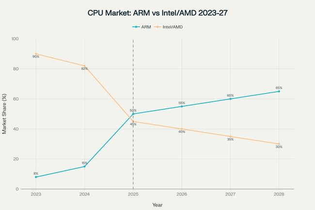 Arm Holdings oznámil mimořádně ambiciózní cíl zvýšit svůj podíl na trhu procesorů pro datová centra z 15% v roce 2024 na 50% již do konce roku 2025. Tento dramatický nárůst je podpořen očekávaným růstem AI serverů, který by podle odhadů měl v následujících letech dosáhnout více než 300%. Společnost staví svou strategii na energetické efektivitě svých procesorů, která je atraktivní pro provozovatele cloudových služeb jako Amazon, Google a Microsoft.