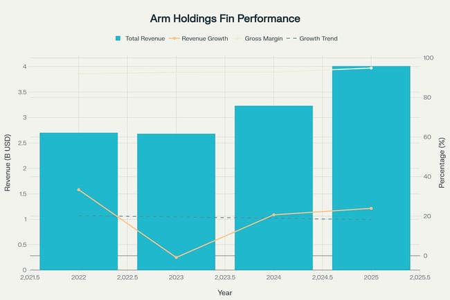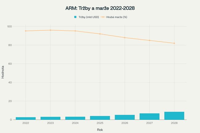 Arm Holdings vybudoval svůj úspěch na unikátním licenčním modelu, který zahrnuje dvě hlavní složky příjmů: licenční poplatky a royalties. Společnost získává fixní licenční poplatky (obvykle $1-10 milionů) za poskytnutí přístupu ke své architektuře, a následně variabilní royalties (typicky 1-2% z prodejní ceny) z každého čipu obsahujícího jejich technologii. Tento model umožnil společnosti dosáhnout mimořádně vysokých marží - v roce 2025 činí hrubá marže téměř 95%, což je hodnota prakticky nedosažitelná pro jiné typy společností.