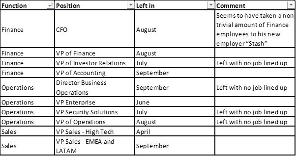 Všiml jsem si také, jak se zdá, neobvyklého počtu vedoucích pracovníků, kteří v posledních měsících opustili společnost - překvapivě mnoho z nich, aniž by měli zajištěnou jinou práci. Byli propuštěni kvůli nízkému výkonu? To by mohlo být pro společnost dobré. Nebo se snaží opustit potápějící se loď? To by bylo špatné. Zde je seznam všech, kteří odešli od dubna 2021: