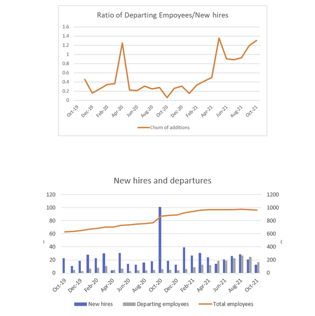 Od března 2021 vyskočil počet lidí, kteří společnost opustili, na historicky extrémně vysokou úroveň (duben 2020 je korona virová odchylka - odešlo 5 lidí, přijati byli 4, čímž na grafu vyniká, i když se toho vlastně moc nestalo). Od března nepřidali žádné čisté zaměstnance a v současné době každý měsíc více zaměstnanců ztrácejí, než nabírají.