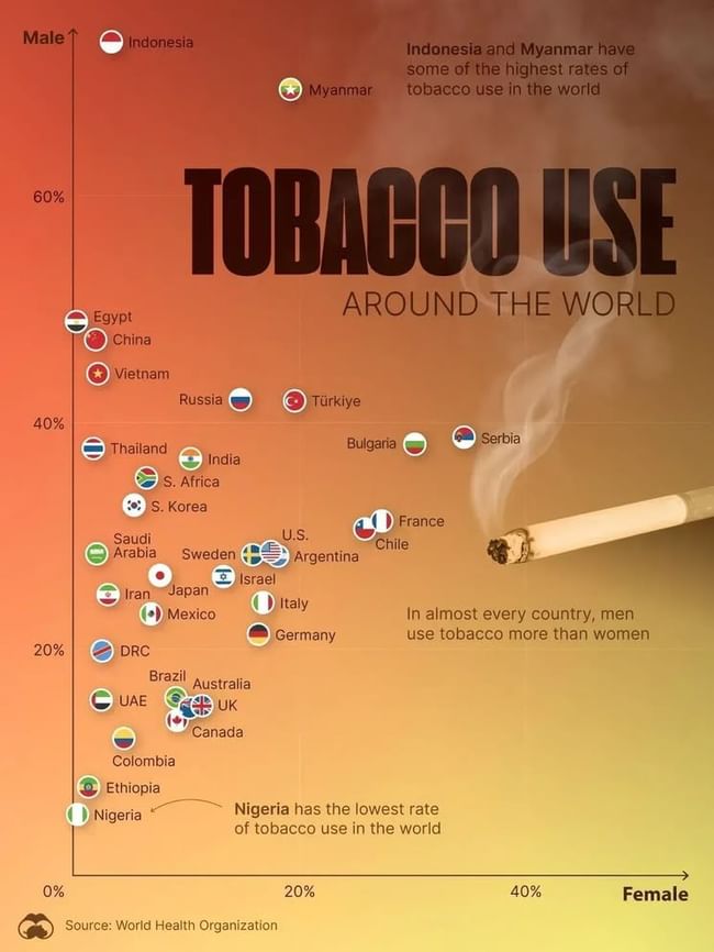 Dle obrázku je vidět, jak kouření vévodí státy Indonesie 🇮🇩 a Barma (Myanmar) 🇲🇲.