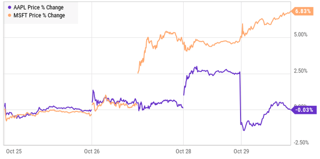 S tím, jak slábnou katalyzátory na celém trhu, zesilují se dopady dobrých a špatných zpráv na konkrétní akcie. V posledním říjnovém týdnu klesly ceny akcií společnosti Apple $AAPL po neuspokojivém oznámení výsledků o téměř 3 %. Konkurenční technologický gigant Microsoft $MSFT překonal očekávání v oblasti tržeb a zisků, což vedlo k nárůstu ceny akcií o téměř 7 % a předstižení společnosti Apple na pozici nejhodnotnější společnosti na veřejných burzách.