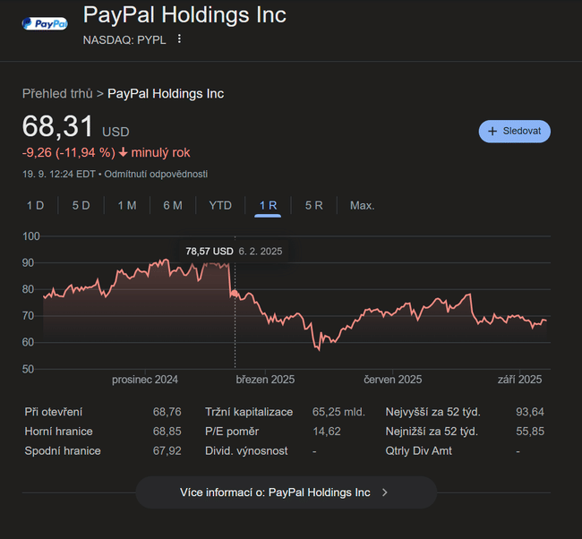 Ta firma léta nic nepředvádí. To konkurence typu $SOFI, Revolut, $WISE.L má investorům co nabídnout, a proto kdo chce růst, ne defenzivní akcie, bude v tomto segmentu volit něco jiného. $PYPL je zkostnatělá, a půjde spíše do boku, než nahoru.