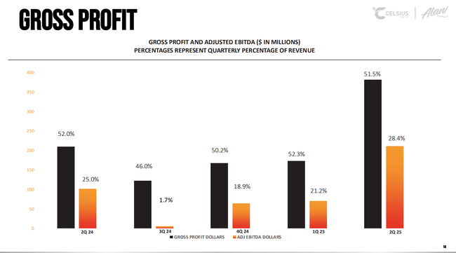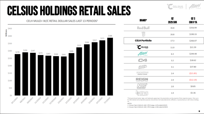 Společnost Celsius Holdings se stala jedním z nejrychleji rostoucích hráčů na trhu energetických nápojů díky svému zaměření na zdravější alternativy bez cukru a s přidanými funkčními složkami, jako jsou vitaminy a antioxidanty. V druhém čtvrtletí roku 2025 dosáhla tržeb 739,3 milionu dolarů, což představuje meziroční růst o 84 %, a upraveného EBITDA ve výši 210,3 milionu dolarů se ziskovou marží 28,4 %. Celsius dnes patří mezi tři největší značky v USA s tržním podílem 16,8 % a podílem 24,5 % na celkovém růstu kategorie energetických nápojů. Společnost úspěšně rozšiřuje distribuci, je přítomná ve více než 240 000 prodejních místech a akvizicí značky Alani Nu, která meziročně rostla o 129 %, dále posílila své portfolio a oslovila širší skupinu zákazníků.