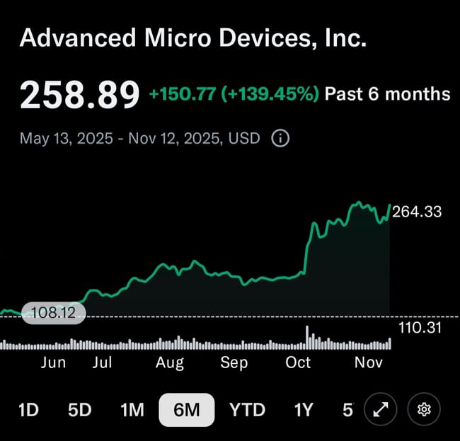 Cena akcie $AMD vyrástla za posledných 6 mesiacov o +139.45% vďaka spolupráci s OpenAI a pozitívnym výhľadom do budúcna.