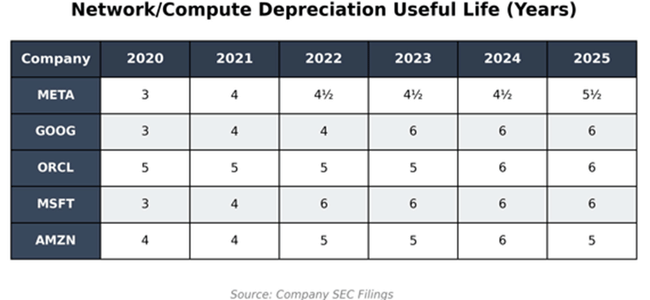 Za posledných 5 rokov spoločnosti, ktoré sú hlavnými odberateľmi čipov pre umelú inteligenciu, predĺžili životnosť svojich serverov takmer na dvojnásobok. Jensen Huang, generálny riaditeľ spoločnosti $NVDA, však tvrdí, že výkon nových čipov sa každé dva roky viac ako zdvojnásobí (en.wikipedia.org/wiki/Huang's_law ). Je ťažké si predstaviť, ako by sa ich životný cyklus mohol predĺžiť namiesto skrátenia.