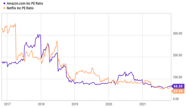 Celkově lze říci, že $NFLX a $AMZN jsou skvělé podniky, které prokázaly, že mohou akcionářům přinášet vynikající výnosy. Aby byly důvody pro jejich koupi ještě přesvědčivější, lze je oba pořídit za téměř nejnižší poměr ceny k zisku za posledních pět let (viz graf). Investoři, kteří chtějí v příštím desetiletí ztrojnásobit své peníze, mohou nákupem akcií společností Netflix a Amazon výrazně zvýšit své šance.