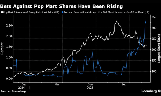 Jenže zatímco hype kolem figurek pokračuje, trh začíná ukazovat úplně jiný sentiment – prudce rostoucí sázky proti akciím (vlastníkem je Pop Mart). Graf od Bloombergu to vystihuje dokonale: krátké pozice (modrá křivka) vyskočily v posledních týdnech na nejvyšší úroveň za více než rok, zatímco cena akcií (bílá křivka) po letním maximu postupně klesá.