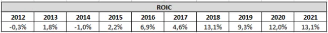 Prvním číslem, které prozkoumáme, je návratnost investičního kapitálu, známá také jako ROIC. Chceme vidět desetiletou historii a chceme, aby se čísla ve všech letech pohybovala nad 10 %.