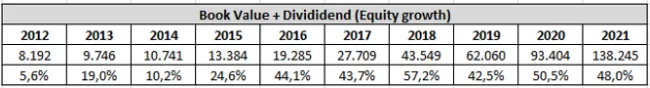 Další čísla jsou účetní hodnota + dividenda. Protože jste zvyklí vidět čísla v procentech, rozhodl jsem se sdílet jak čísla, tak procentuální růst v jednotlivých letech. Jedná se o mnohem uklidňující čísla, protože společnost Amazon zvyšovala svůj vlastní kapitál v posledních 10 letech rychlým tempem.