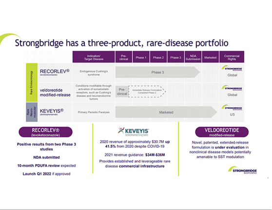 Jedná se o bio farmaceutickou společnost v komerční fázi se zaměřením na vývoj a komercializaci léků na vzácná onemocnění. Momentálně má firma jeden produkt na trhu viz obrázek níže a dva ve vývoji a fázi schválení. KEVEYIS je prozatím jediným příjmem firmy. Za rok 2020 z něj byly profity 30,7 milionů $ z trhu který tvoří 500 milionů $. Zisk za rok 2021 je odhadován na 36 milionů a firma v poslední prezentaci uvedla, že hodlá u KEVEYISU dosáhnout zisku 50 milionů $ v příštích pár letech. Na druhý produkt Veldoreotide se prozatím nebudeme zaměřovat, nachází se teprve na začátku výzkumu, přesto si Firma nechala patentovat formuli na jeho vytvoření. Co nás opravdu zajímá a mohlo by způsobit až 150 % zhodnocení je produkt třetí, RECORLEV.