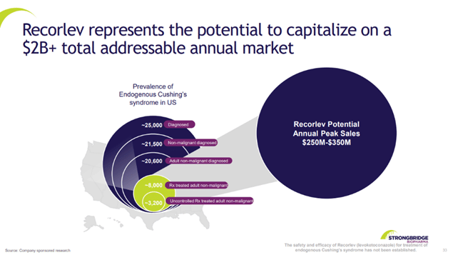 RECORLEV byl vyvinut jako lék na vzácný Cushingův Syndrom a Strongbridge již podala žádost o „kontrolu potravin a léčiv“ (NDA) „úřadu pro kontrolu potravin a léčiv“ (FDA). RECORLEV již předtím prošel prvními třemi fázemi testování a zamítnutí (FDA) je proto velmi nepravděpodobné. Zákon PDUFA dává (FDA) 10 měsíců na schválení nebo zamítnutí produktu. V případě schválení do koce roku 2021, předpokládá Strongbridge spuštění prodeje léku v prvním kvartálu roku 2022. Na trhu se momentálně nachází pouze dvě další firmy, které by lék na tuto nemoc nabízeli a jedna z nich $CORT má dokonce kapitalizaci 2,65 miliard $, momentálně skoro 14krát větší než $SBBP i přesto, že vydělává prakticky pouze na lécích proti Cushingovu syndromu a to jen 350 milionů $ ročně.