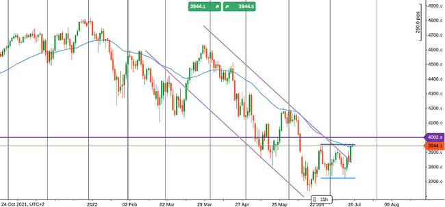 Nedávný růst se však zdá až příliš optimistický vzhledem k tomu, že aktuálně v USA probíhá výsledková sezóna za druhý kvartál roku, která by měla ukázat první efekty války na Ukrajině na výsledky amerických firem. Dobrým ukazatelem jsou v tomto ohledu hospodářské výsledky amerických bank, které byly až na výjimky investory přijaty spíše negativně. Ke konci července navíc očekáváme další zvýšení úrokových sazeb americkou centrální bankou, což může způsobit opětovnou korekci na indexu S&P 500. Hranice 4 000 bodů by tak mohla v následujících dnech zapůsobit jako velmi silná rezistence.