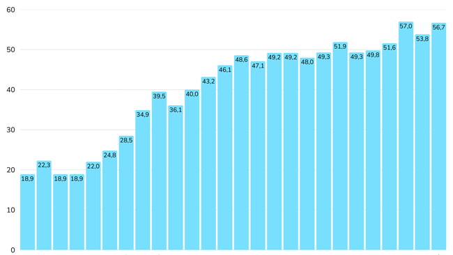 Tržby od roku 2000 vzrostly z dřívějších 19 miliard dolarů na loňských 56,7 miliard dolarů.