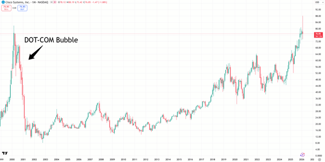 Pád o 90 % je dnes u Cisco spíš extrémně nepravděpodobný tehdy šlo o splasknutí technologické bubliny, zatímco dnes má firma stabilní zisky, cashflow i silnější bilanci. Pokud je ale akcie nad férovou hodnotou, reálné riziko je spíš klasická valuací driven korekce než historický kolaps, takže připomínka minulosti dává smysl hlavně jako lekce o sentimentu trh