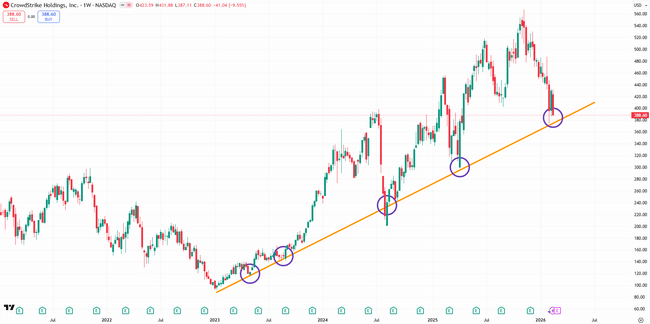 Co je ale nejzajímavější, je trendová linka, kterou cena akcií $CRWD respektuje již od roku 2023 a která cenu akcií již 4x v minulosti podržela od hlubšího propadu.