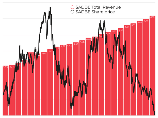 Cena akcie by ani neměla odrážet to, jak se společnosti daří (resp. dařilo v minulosti), ale především to, jak se jí bude dařit v budoucnu. A právě tady mají někteří investoři silné obavy: obchodní model Adobe se může s nástupem AI výrazně a rychle proměnit a pokud se firma nedokáže dostatečně rychle a správně přizpůsobit, mohou její budoucí tržby citelně klesnout.