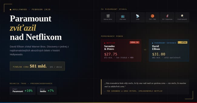 Paramount Skydance, vedený Davidom Ellisonom, zvíťazil v jednej z najdramatickejších akvizičných bitiek v histórii Hollywoodu. Netflix sa vzdal zápolenia potom, čo Warnerov predstavenstvo vyhlásilo Paramountovu ponuku 31 dolárov za akciu – celkovo asi 81 miliárd dolárov – za superiórnu.