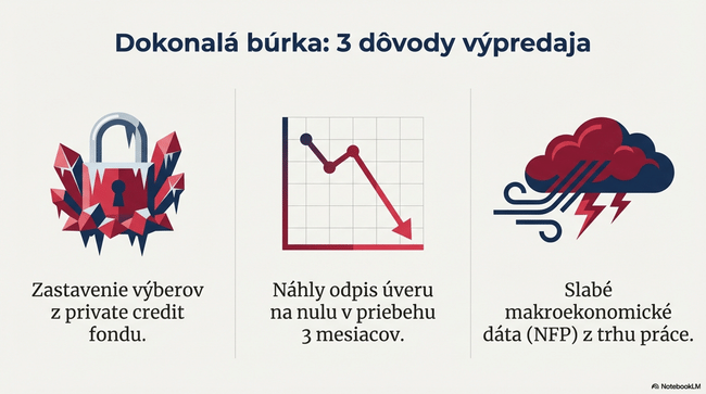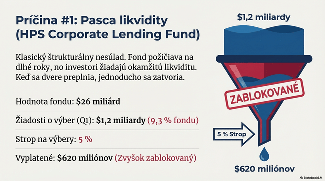 🔴 HLAVNÁ PRÍČINA: Zastavenie výberov z private credit fonduBlackRock vlastní $26 miliardový HPS Corporate Lending Fund — fond zameraný na súkromné úvery firmám. V prvom kvartáli investori požiadali o výber $1,2 miliardy, čo predstavuje 9,3 % čistej hodnoty fondu.Problém? Fond má strop na 5 % výberov za kvartál. Vyplatil $620 miliónov a zvyšok jednoducho zablokoval.Toto je klasická ukážka štrukturálneho nesúladu — fond požičiava peniaze na dlhé roky, ale investori chcú likviditu rýchlo. Keď ich príde príliš veľa naraz, dvere sa zatvoria.