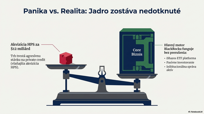 Dôležité je rozlíšiť: toto nie je problém jadra BlackRock biznisu. iShares ETF platforma, pasívne investovanie, inštitucionálna správa aktív — to všetko funguje ďalej.