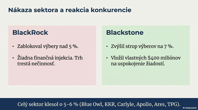 🔴 Blue Owl, KKR, Carlyle, Apollo, Ares, TPG — každý klesol o 5–6 %Pre porovnanie — Blackstone tento týždeň zvýšil strop výberov z 5 % na 7 % a vložil vlastných $400 miliónov, aby uspokojil všetky žiadosti. BlackRock takýto krok neurobil — a trh si to všimol.