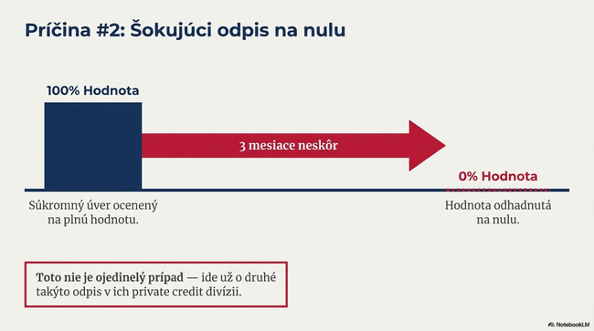 ⚠️ DRUHÝ PROBLÉM: Odpis úveru na nuluLen deň pred tým vyšlo najavo, že BlackRock odpísal hodnotu súkromného úveru na nulu — len 3 mesiace po tom, čo ho ocenil na plnú hodnotu. A nejde o prvý prípad — je to už druhý takýto odpis v ich private credit divízii.
